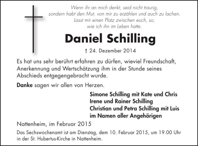 Hier finden Sie alle Traueranzeigen aus der Zeitung, die bisher für Daniel Schilling erschienen sind. Weitere Traueranzeigen, die in der Zeitung erscheinen, werden hier ebenfalls aufgelistet