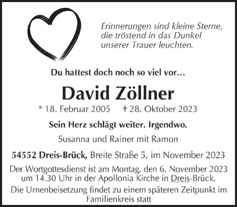 Hier finden Sie alle Traueranzeigen aus der Zeitung, die bisher für David Zöllner erschienen sind. Weitere Traueranzeigen, die in der Zeitung erscheinen, werden hier ebenfalls aufgelistet