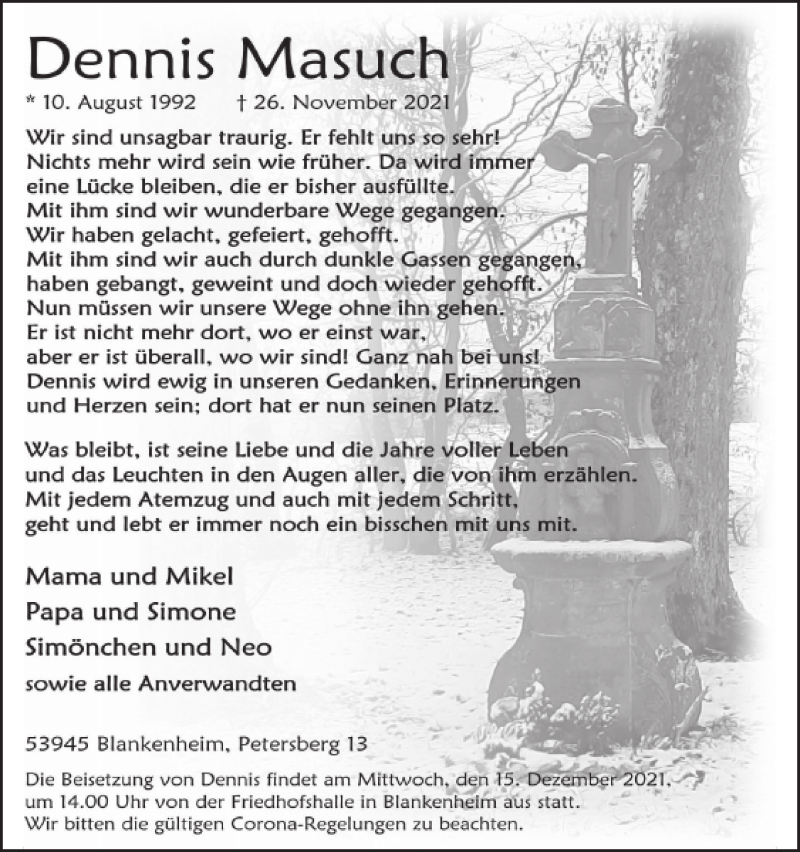 Hier finden Sie alle Traueranzeigen aus der Zeitung, die bisher für Dennis Masuch erschienen sind. Weitere Traueranzeigen, die in der Zeitung erscheinen, werden hier ebenfalls aufgelistet