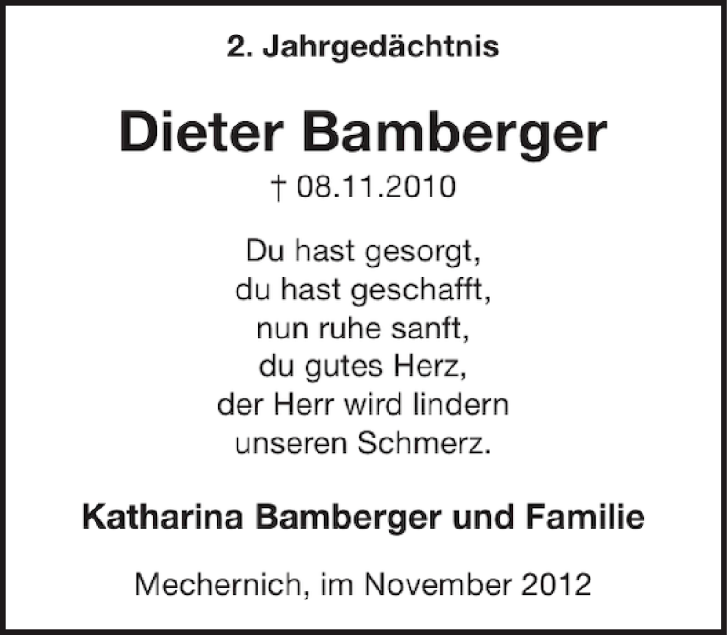 Hier finden Sie alle Traueranzeigen aus der Zeitung, die bisher für Dieter Bamberger erschienen sind. Weitere Traueranzeigen, die in der Zeitung erscheinen, werden hier ebenfalls aufgelistet
