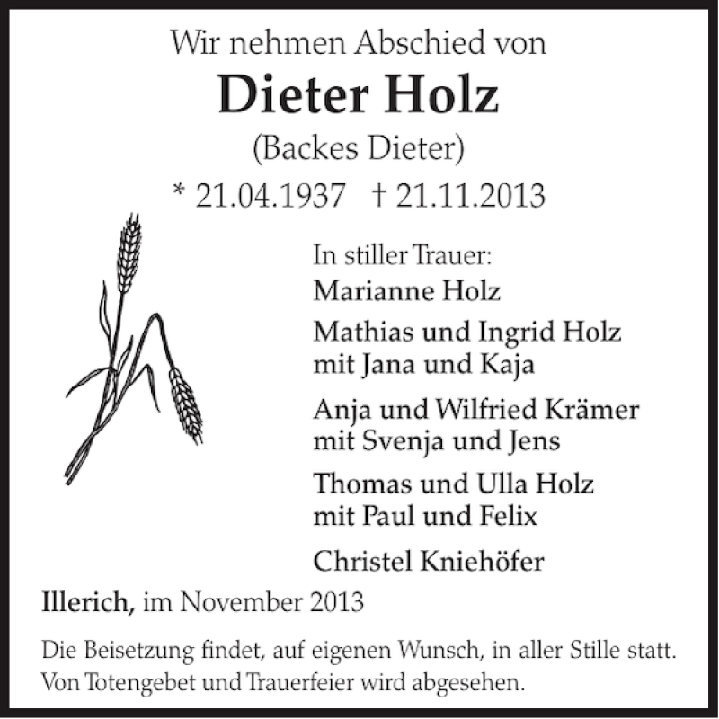 Hier finden Sie alle Traueranzeigen aus der Zeitung, die bisher für Dieter Holz erschienen sind. Weitere Traueranzeigen, die in der Zeitung erscheinen, werden hier ebenfalls aufgelistet
