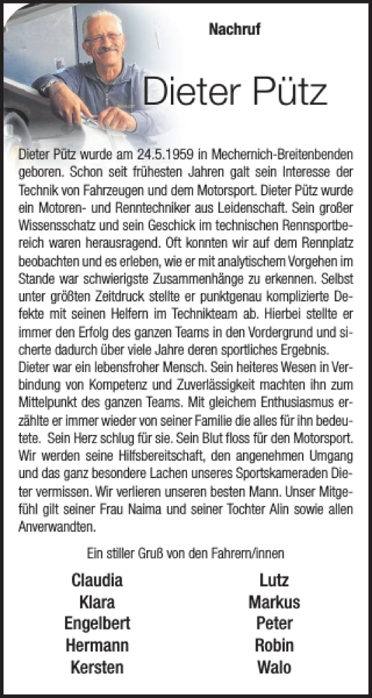 Hier finden Sie alle Traueranzeigen aus der Zeitung, die bisher für Dieter Pütz erschienen sind. Weitere Traueranzeigen, die in der Zeitung erscheinen, werden hier ebenfalls aufgelistet