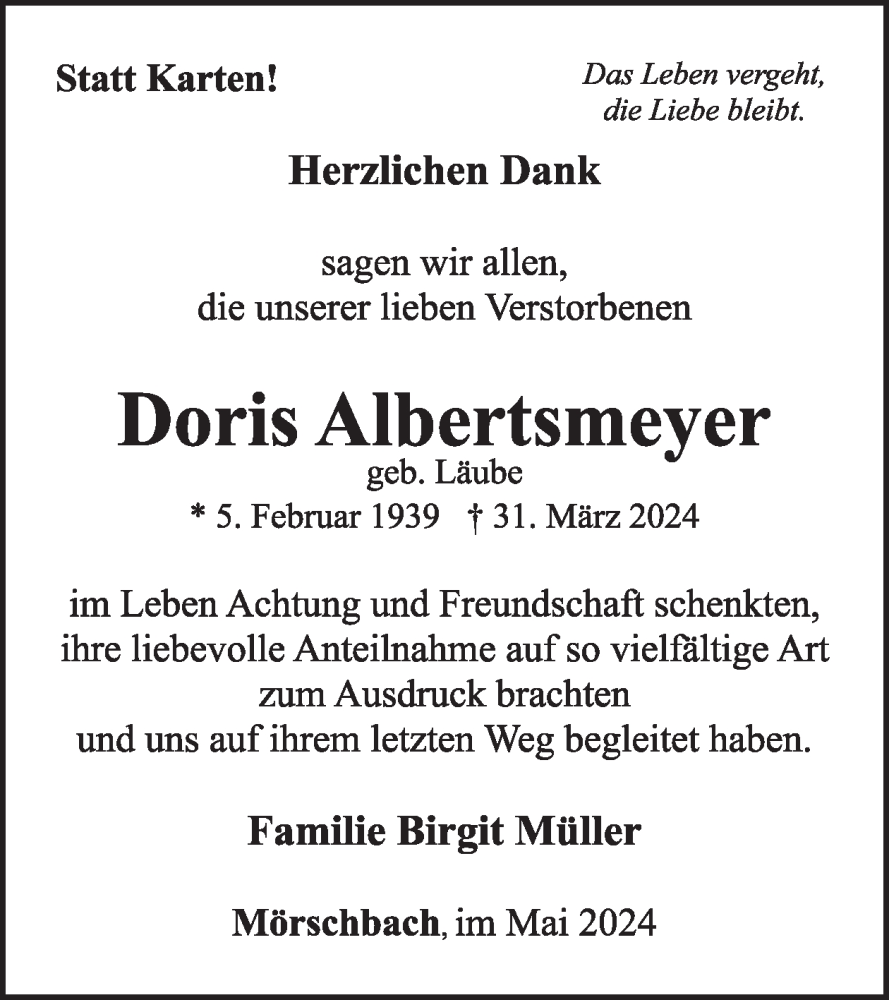 Hier finden Sie alle Traueranzeigen aus der Zeitung, die bisher für Doris Albertsmeyer erschienen sind. Weitere Traueranzeigen, die in der Zeitung erscheinen, werden hier ebenfalls aufgelistet