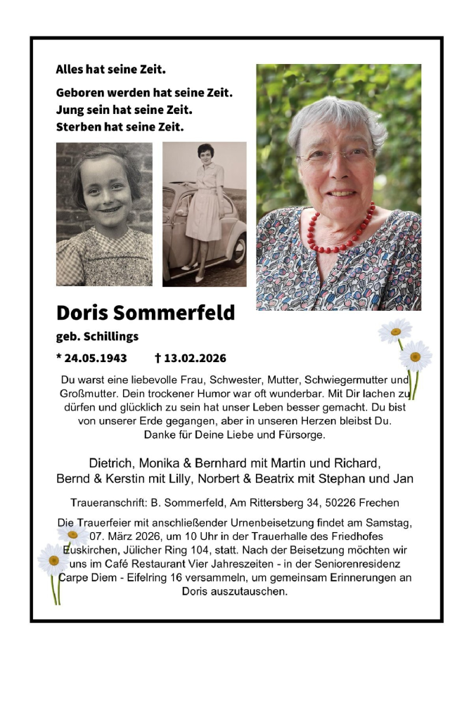 Hier finden Sie alle Traueranzeigen aus der Zeitung, die bisher für Doris Sommerfeld erschienen sind. Weitere Traueranzeigen, die in der Zeitung erscheinen, werden hier ebenfalls aufgelistet
