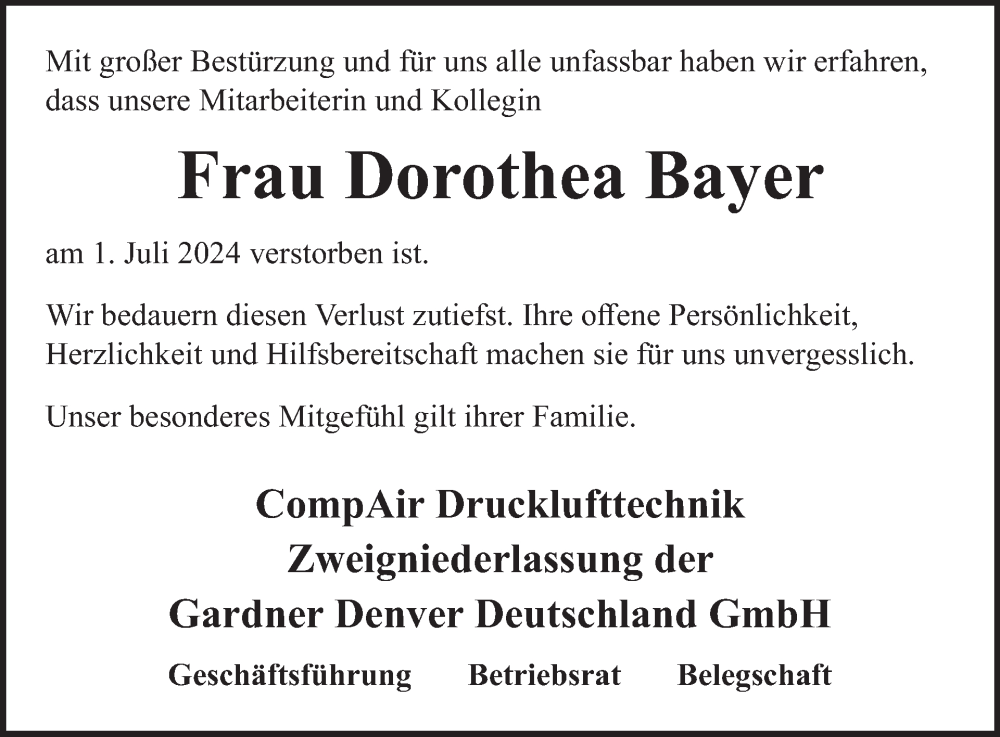 Hier finden Sie alle Traueranzeigen aus der Zeitung, die bisher für Dorothea Bayer erschienen sind. Weitere Traueranzeigen, die in der Zeitung erscheinen, werden hier ebenfalls aufgelistet
