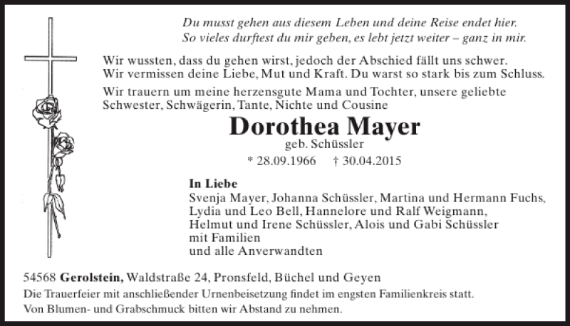 Hier finden Sie alle Traueranzeigen aus der Zeitung, die bisher für Dorothea Mayer erschienen sind. Weitere Traueranzeigen, die in der Zeitung erscheinen, werden hier ebenfalls aufgelistet