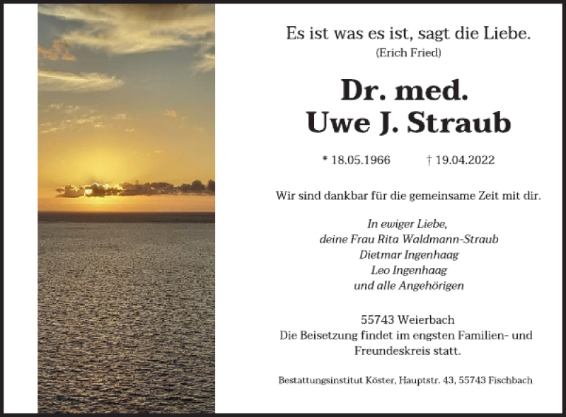 Hier finden Sie alle Traueranzeigen aus der Zeitung, die bisher für Dr. med. Uwe J. Straub erschienen sind. Weitere Traueranzeigen, die in der Zeitung erscheinen, werden hier ebenfalls aufgelistet