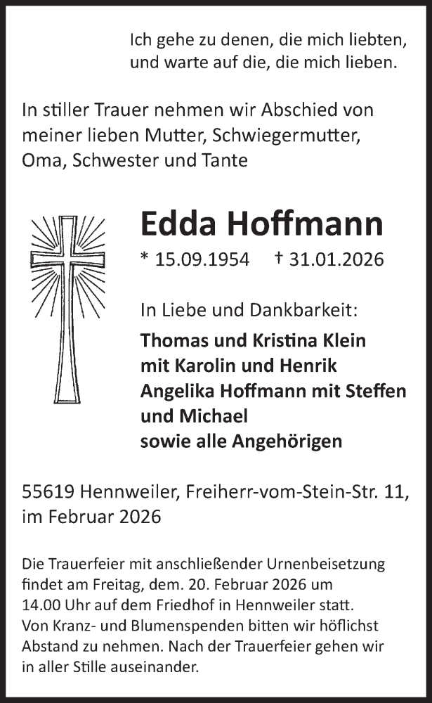 Hier finden Sie alle Traueranzeigen aus der Zeitung, die bisher für Edda Hoffmann erschienen sind. Weitere Traueranzeigen, die in der Zeitung erscheinen, werden hier ebenfalls aufgelistet