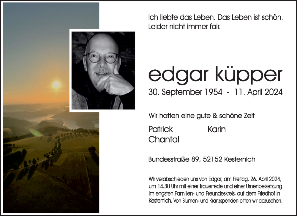 Hier finden Sie alle Traueranzeigen aus der Zeitung, die bisher für Edgar Küpper erschienen sind. Weitere Traueranzeigen, die in der Zeitung erscheinen, werden hier ebenfalls aufgelistet