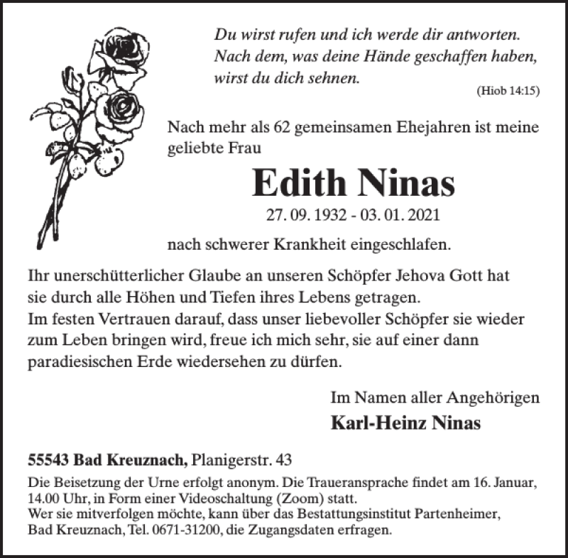 Hier finden Sie alle Traueranzeigen aus der Zeitung, die bisher für Edith Ninas erschienen sind. Weitere Traueranzeigen, die in der Zeitung erscheinen, werden hier ebenfalls aufgelistet