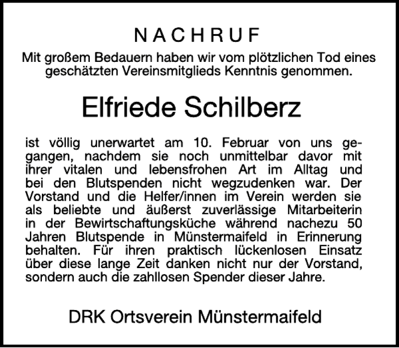 Hier finden Sie alle Traueranzeigen aus der Zeitung, die bisher für Elfriede Schilberz erschienen sind. Weitere Traueranzeigen, die in der Zeitung erscheinen, werden hier ebenfalls aufgelistet