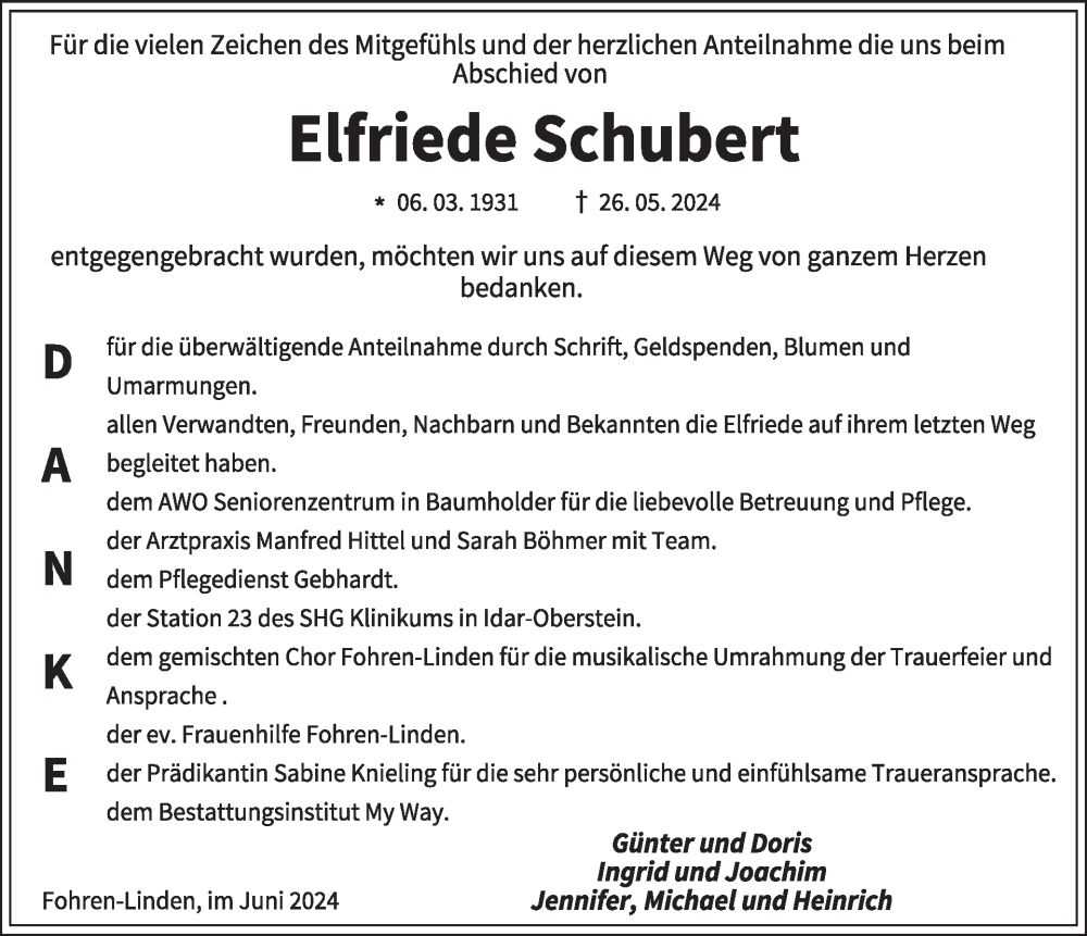 Hier finden Sie alle Traueranzeigen aus der Zeitung, die bisher für Elfriede Schubert erschienen sind. Weitere Traueranzeigen, die in der Zeitung erscheinen, werden hier ebenfalls aufgelistet