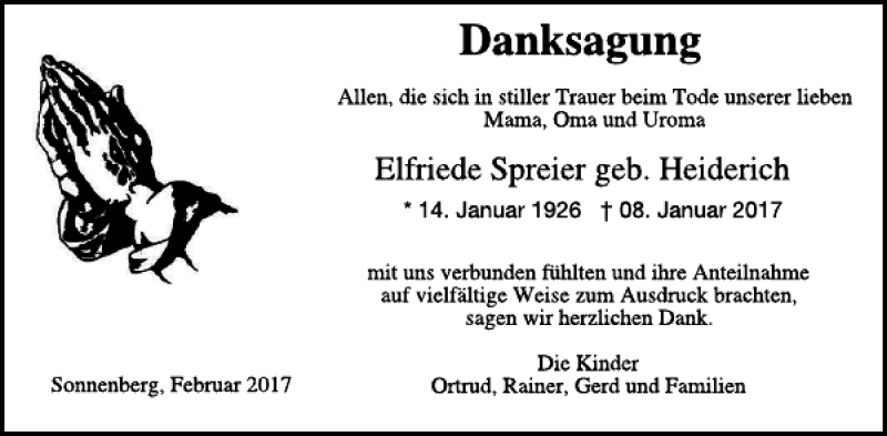 Hier finden Sie alle Traueranzeigen aus der Zeitung, die bisher für Elfriede Spreier erschienen sind. Weitere Traueranzeigen, die in der Zeitung erscheinen, werden hier ebenfalls aufgelistet