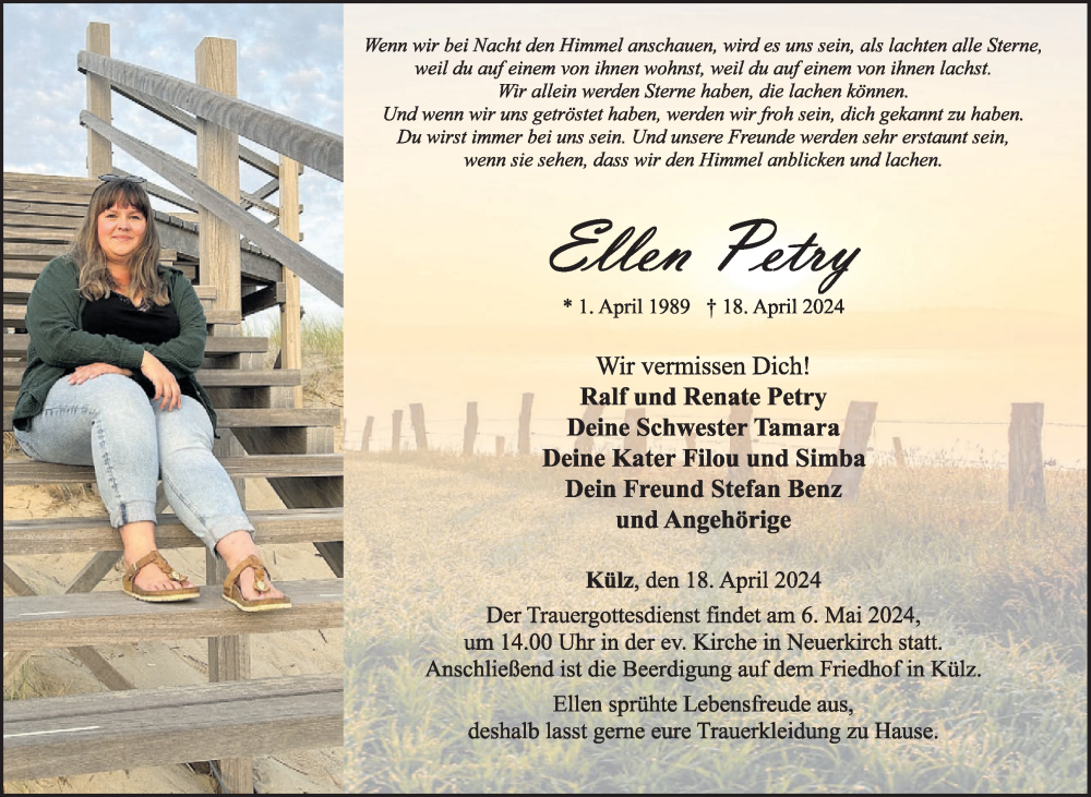 Hier finden Sie alle Traueranzeigen aus der Zeitung, die bisher für Ellen Petry erschienen sind. Weitere Traueranzeigen, die in der Zeitung erscheinen, werden hier ebenfalls aufgelistet