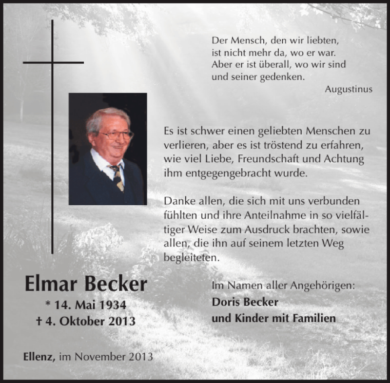 Hier finden Sie alle Traueranzeigen aus der Zeitung, die bisher für Elmar Becker erschienen sind. Weitere Traueranzeigen, die in der Zeitung erscheinen, werden hier ebenfalls aufgelistet