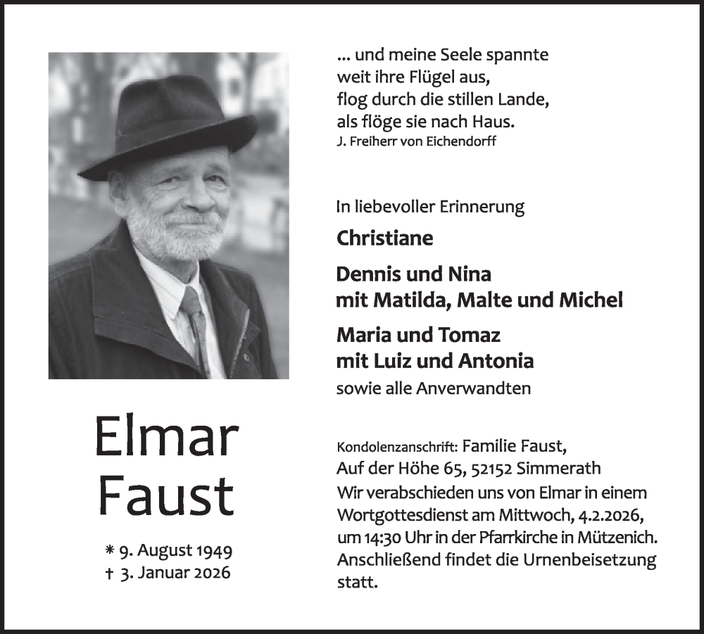 Hier finden Sie alle Traueranzeigen aus der Zeitung, die bisher für Elmar Faust erschienen sind. Weitere Traueranzeigen, die in der Zeitung erscheinen, werden hier ebenfalls aufgelistet