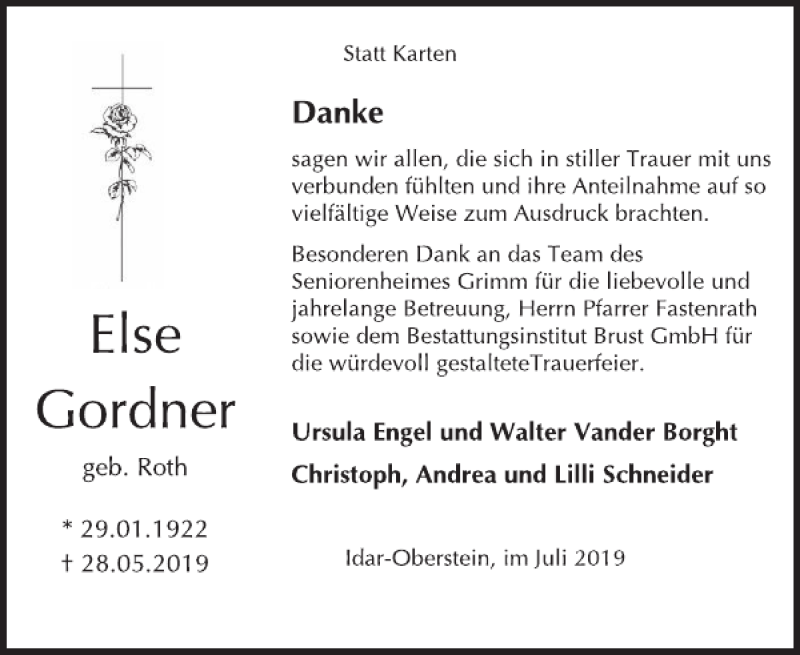 Hier finden Sie alle Traueranzeigen aus der Zeitung, die bisher für Else Gordner erschienen sind. Weitere Traueranzeigen, die in der Zeitung erscheinen, werden hier ebenfalls aufgelistet
