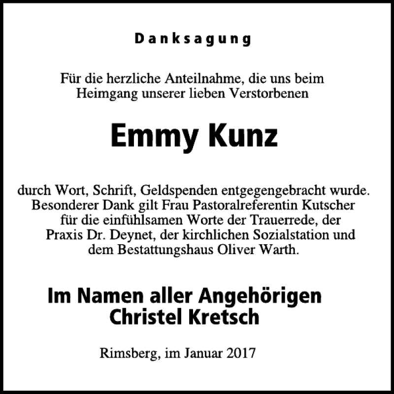 Hier finden Sie alle Traueranzeigen aus der Zeitung, die bisher für Emmy Kunz erschienen sind. Weitere Traueranzeigen, die in der Zeitung erscheinen, werden hier ebenfalls aufgelistet