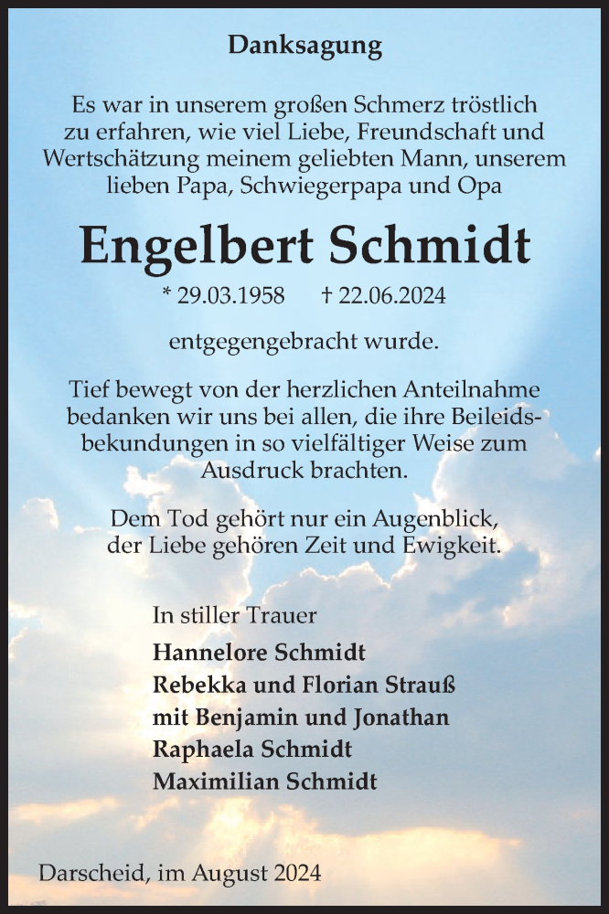 Hier finden Sie alle Traueranzeigen aus der Zeitung, die bisher für Engelbert Schmidt erschienen sind. Weitere Traueranzeigen, die in der Zeitung erscheinen, werden hier ebenfalls aufgelistet