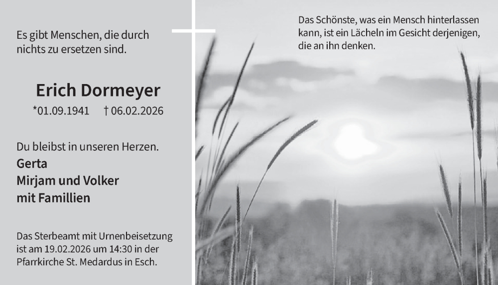 Hier finden Sie alle Traueranzeigen aus der Zeitung, die bisher für Erich Dormeyer erschienen sind. Weitere Traueranzeigen, die in der Zeitung erscheinen, werden hier ebenfalls aufgelistet