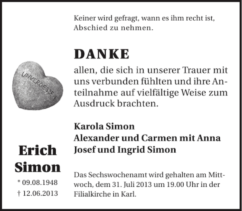 Hier finden Sie alle Traueranzeigen aus der Zeitung, die bisher für Erich Simon erschienen sind. Weitere Traueranzeigen, die in der Zeitung erscheinen, werden hier ebenfalls aufgelistet