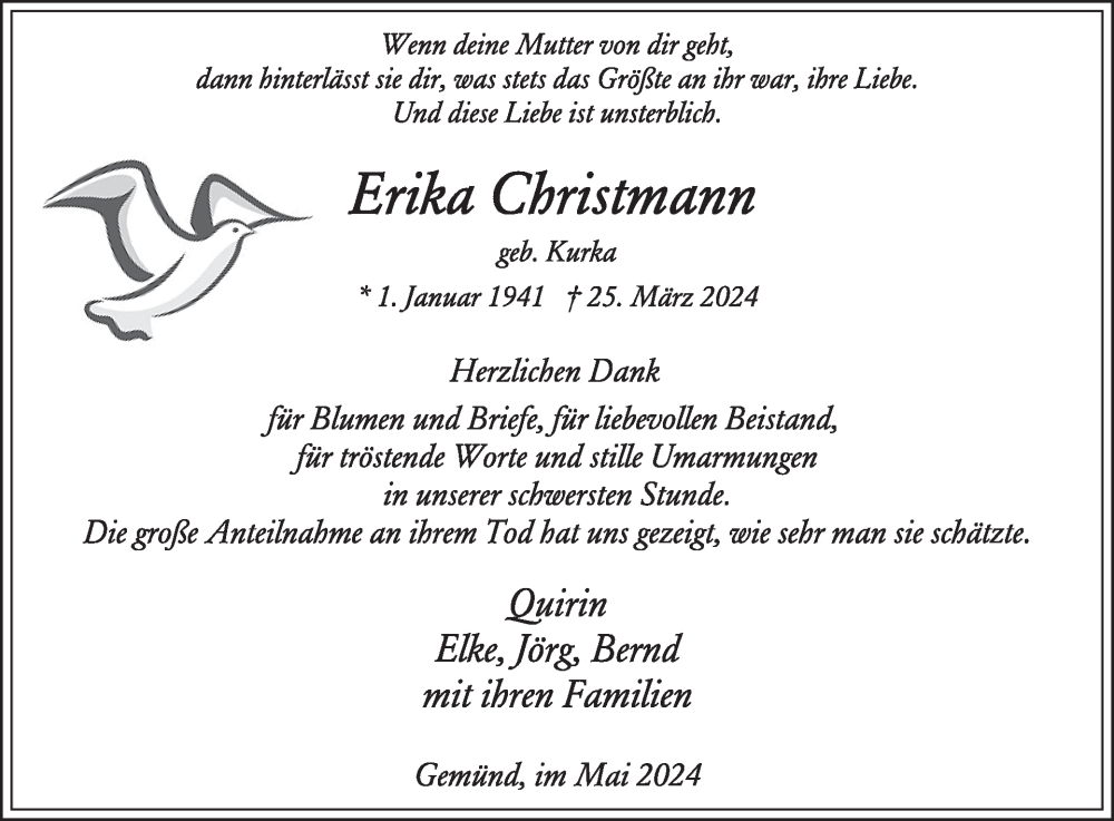 Hier finden Sie alle Traueranzeigen aus der Zeitung, die bisher für Erika Christmann erschienen sind. Weitere Traueranzeigen, die in der Zeitung erscheinen, werden hier ebenfalls aufgelistet