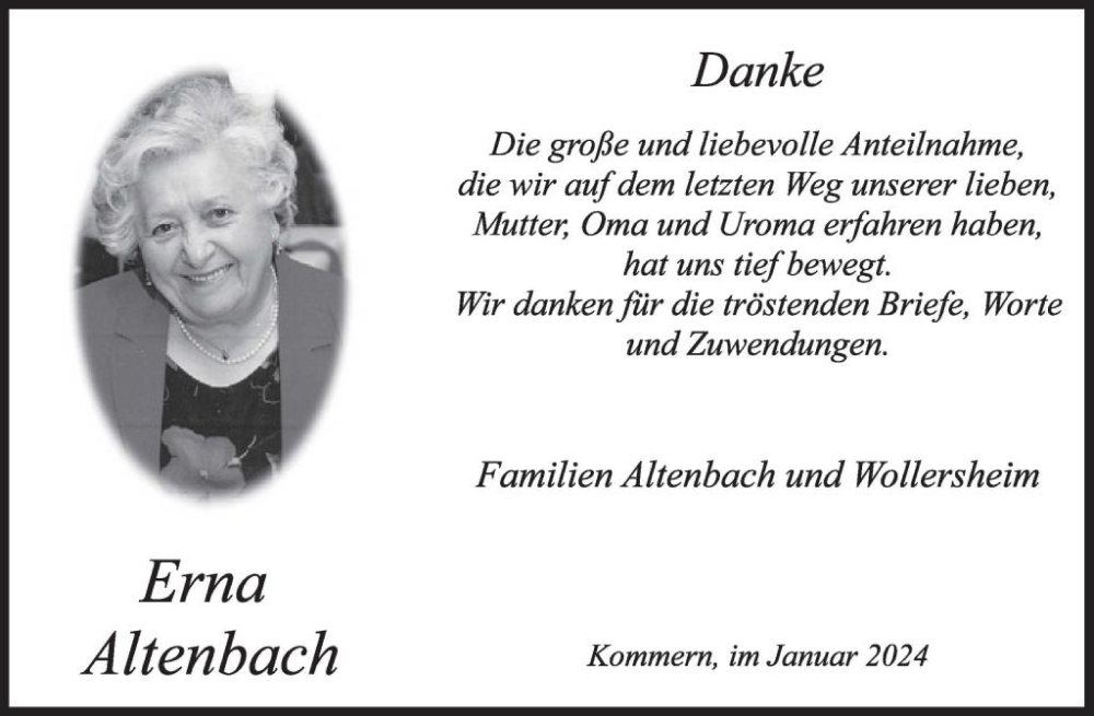 Hier finden Sie alle Traueranzeigen aus der Zeitung, die bisher für Erna Altenbach erschienen sind. Weitere Traueranzeigen, die in der Zeitung erscheinen, werden hier ebenfalls aufgelistet