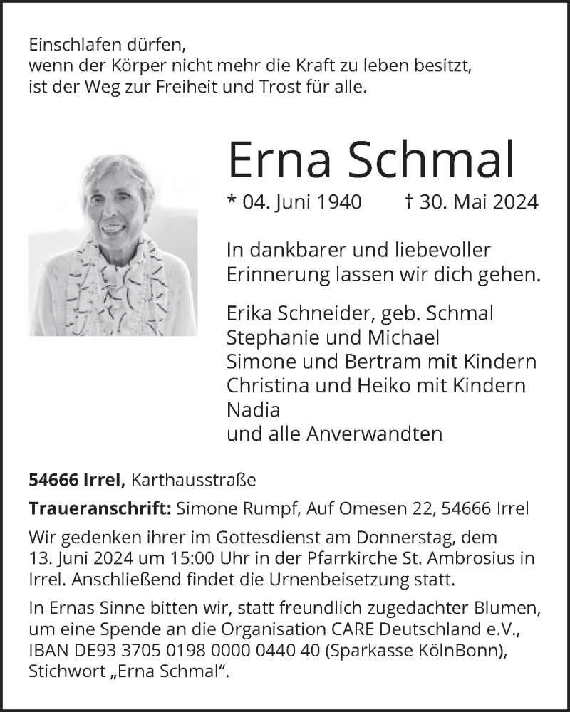 Hier finden Sie alle Traueranzeigen aus der Zeitung, die bisher für Erna Schmal erschienen sind. Weitere Traueranzeigen, die in der Zeitung erscheinen, werden hier ebenfalls aufgelistet