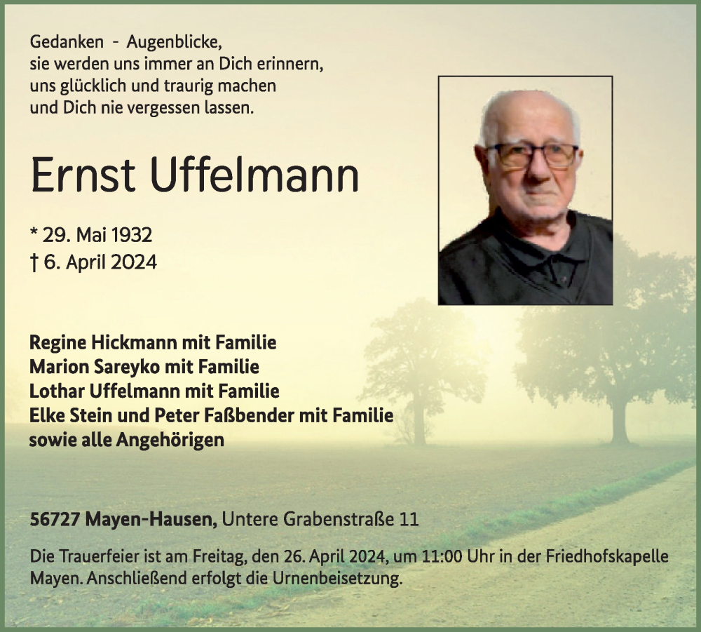 Hier finden Sie alle Traueranzeigen aus der Zeitung, die bisher für Ernst Uffelmann erschienen sind. Weitere Traueranzeigen, die in der Zeitung erscheinen, werden hier ebenfalls aufgelistet