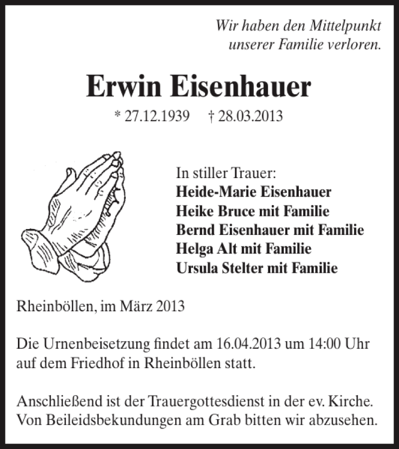Hier finden Sie alle Traueranzeigen aus der Zeitung, die bisher für Erwin Eisenhauer erschienen sind. Weitere Traueranzeigen, die in der Zeitung erscheinen, werden hier ebenfalls aufgelistet