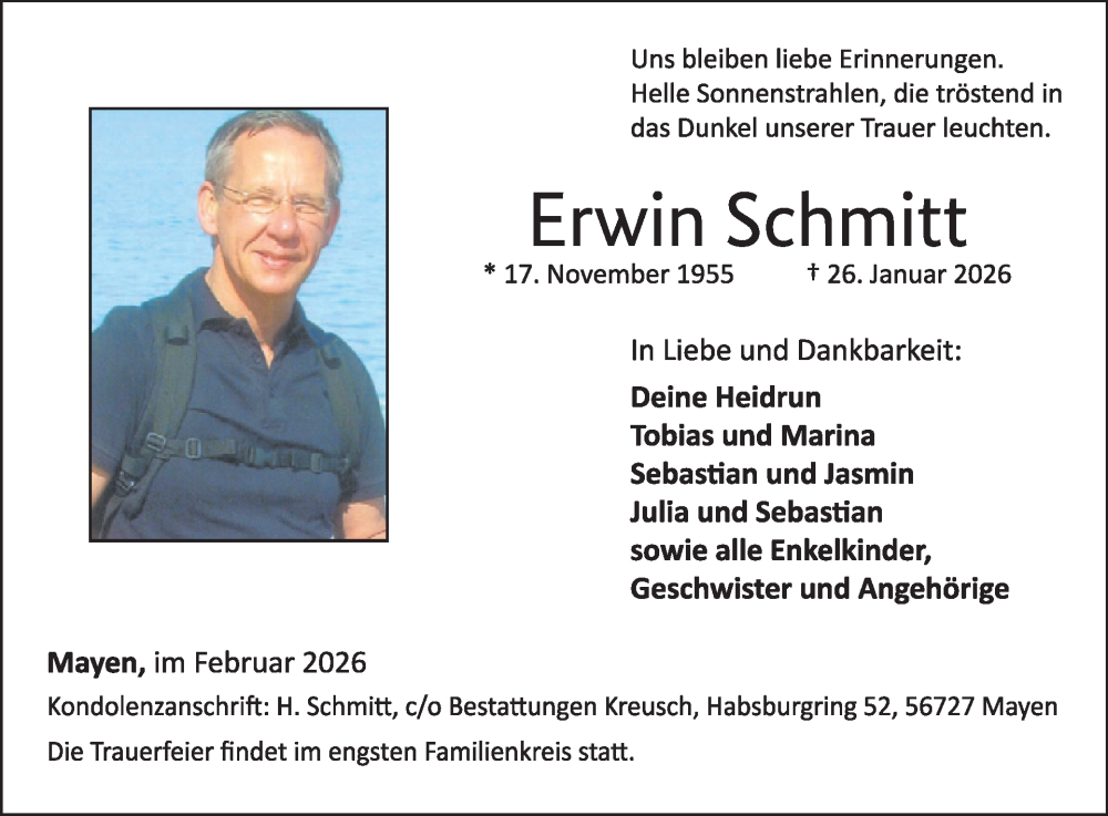 Hier finden Sie alle Traueranzeigen aus der Zeitung, die bisher für Erwin Schmitt erschienen sind. Weitere Traueranzeigen, die in der Zeitung erscheinen, werden hier ebenfalls aufgelistet