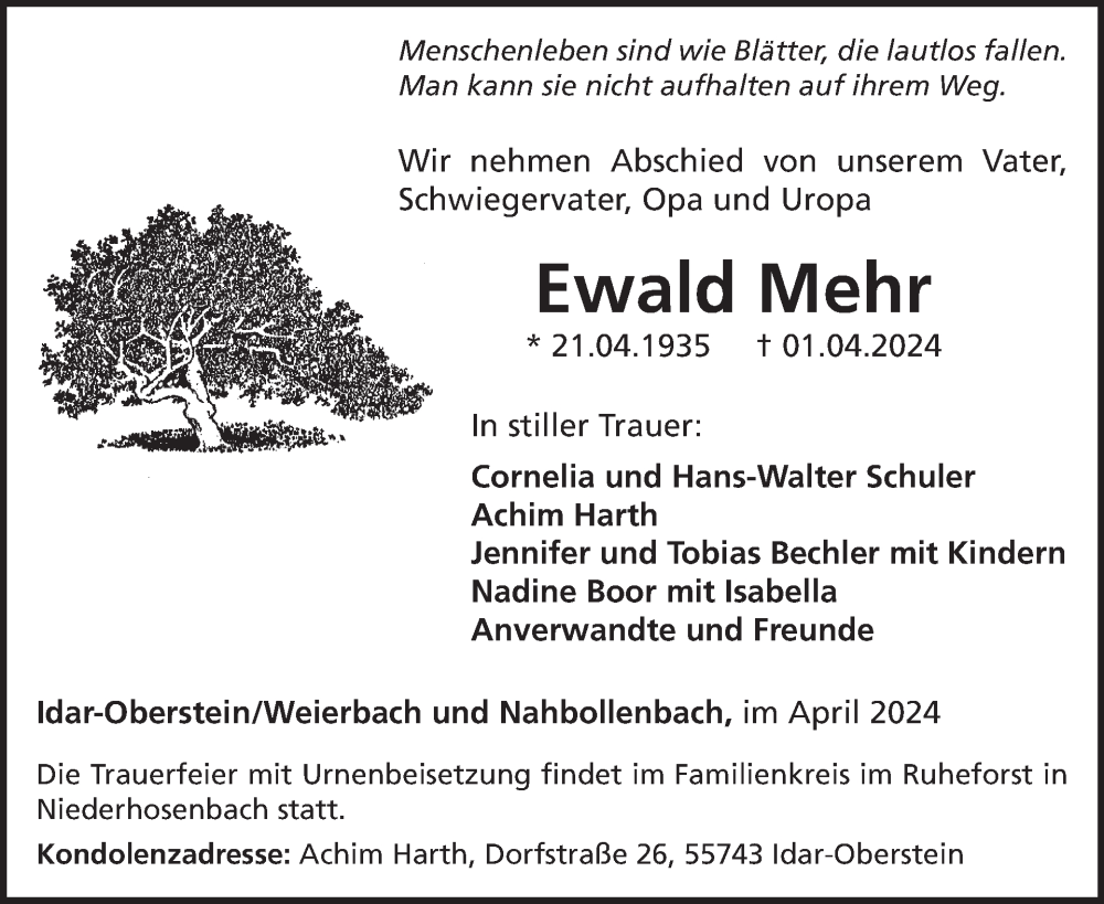 Hier finden Sie alle Traueranzeigen aus der Zeitung, die bisher für Ewald Mehr erschienen sind. Weitere Traueranzeigen, die in der Zeitung erscheinen, werden hier ebenfalls aufgelistet