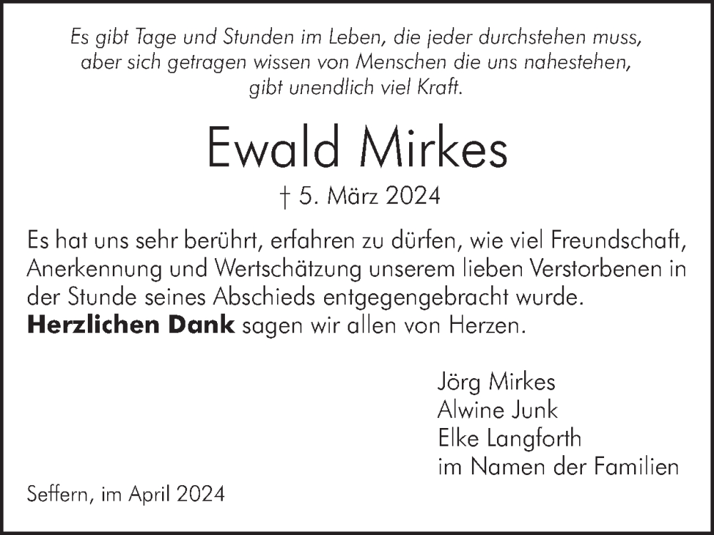 Hier finden Sie alle Traueranzeigen aus der Zeitung, die bisher für Ewald Mirkes erschienen sind. Weitere Traueranzeigen, die in der Zeitung erscheinen, werden hier ebenfalls aufgelistet