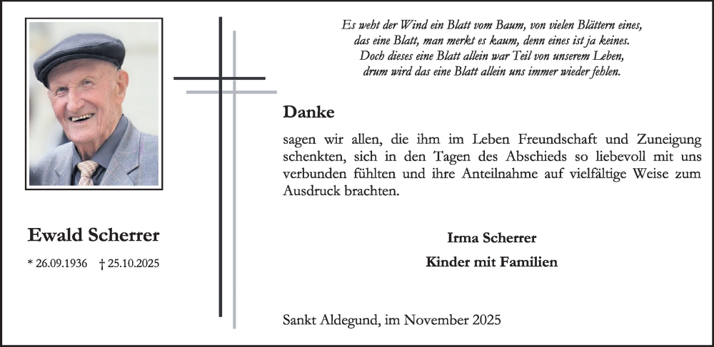 Hier finden Sie alle Traueranzeigen aus der Zeitung, die bisher für Ewald Scherrer erschienen sind. Weitere Traueranzeigen, die in der Zeitung erscheinen, werden hier ebenfalls aufgelistet