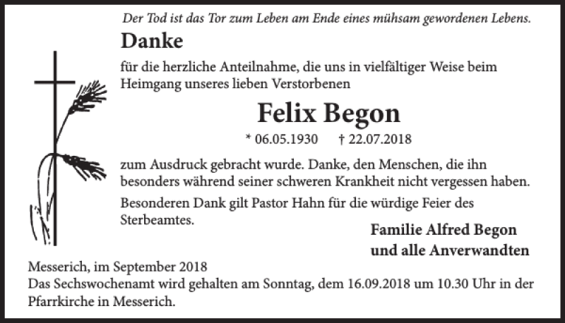 Hier finden Sie alle Traueranzeigen aus der Zeitung, die bisher für Felix Begon erschienen sind. Weitere Traueranzeigen, die in der Zeitung erscheinen, werden hier ebenfalls aufgelistet