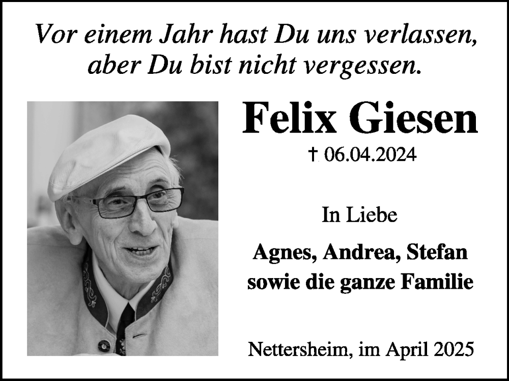 Hier finden Sie alle Traueranzeigen aus der Zeitung, die bisher für Felix Giesen erschienen sind. Weitere Traueranzeigen, die in der Zeitung erscheinen, werden hier ebenfalls aufgelistet
