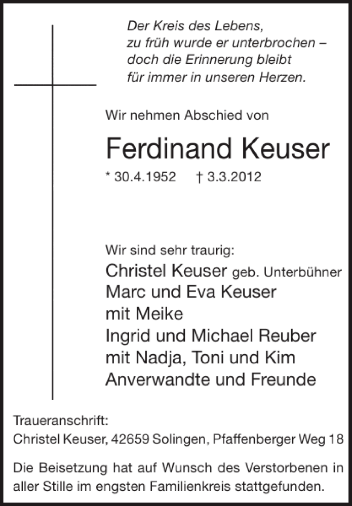 Hier finden Sie alle Traueranzeigen aus der Zeitung, die bisher für Ferdinand Keuser erschienen sind. Weitere Traueranzeigen, die in der Zeitung erscheinen, werden hier ebenfalls aufgelistet