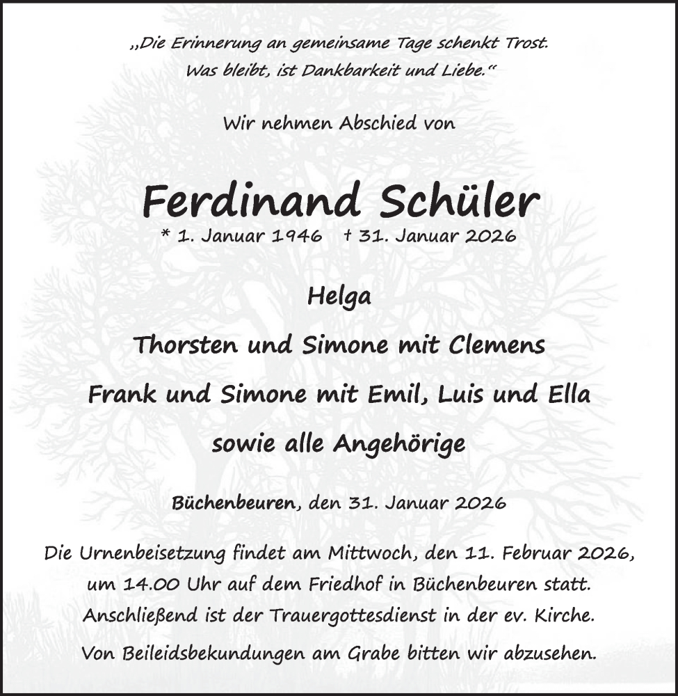 Hier finden Sie alle Traueranzeigen aus der Zeitung, die bisher für Ferdinand Schüler erschienen sind. Weitere Traueranzeigen, die in der Zeitung erscheinen, werden hier ebenfalls aufgelistet