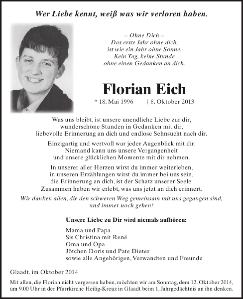 Hier finden Sie alle Traueranzeigen aus der Zeitung, die bisher für Florian Eich erschienen sind. Weitere Traueranzeigen, die in der Zeitung erscheinen, werden hier ebenfalls aufgelistet