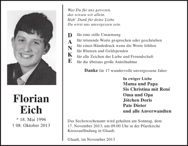 Hier finden Sie alle Traueranzeigen aus der Zeitung, die bisher für Florian Eich erschienen sind. Weitere Traueranzeigen, die in der Zeitung erscheinen, werden hier ebenfalls aufgelistet