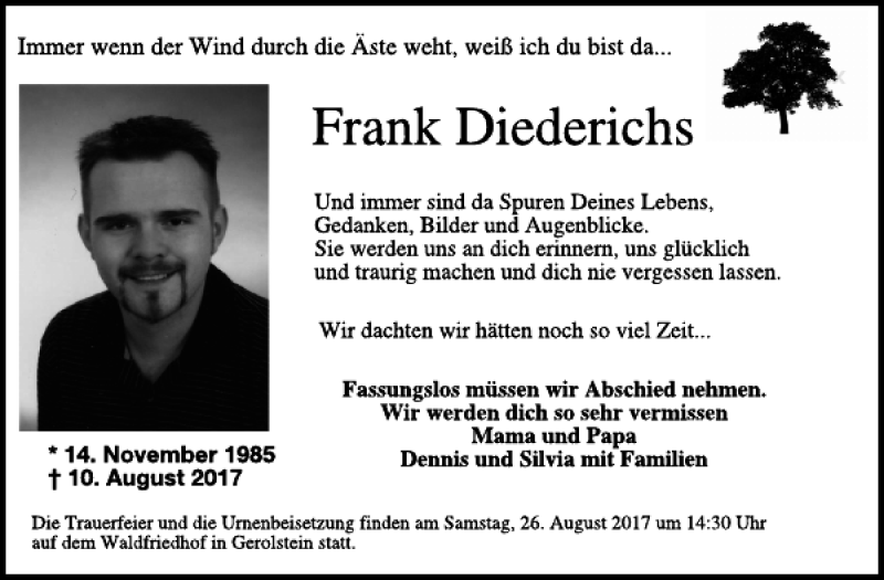 Hier finden Sie alle Traueranzeigen aus der Zeitung, die bisher für Frank Diederichs erschienen sind. Weitere Traueranzeigen, die in der Zeitung erscheinen, werden hier ebenfalls aufgelistet