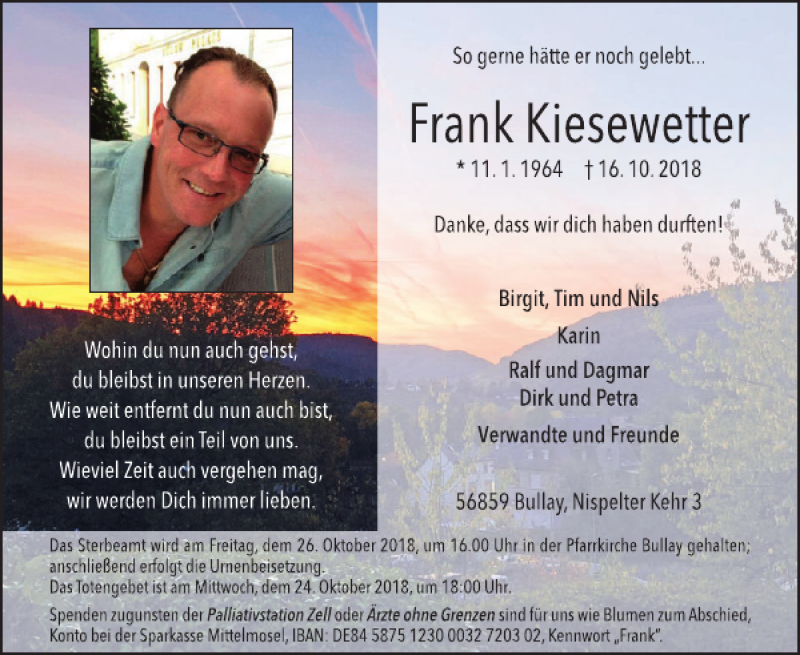 Hier finden Sie alle Traueranzeigen aus der Zeitung, die bisher für Frank Kiesewetter erschienen sind. Weitere Traueranzeigen, die in der Zeitung erscheinen, werden hier ebenfalls aufgelistet