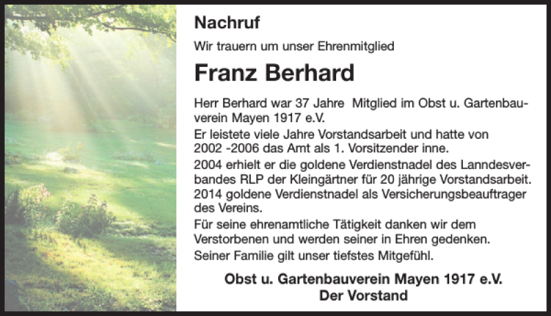 Hier finden Sie alle Traueranzeigen aus der Zeitung, die bisher für Franz Berhard erschienen sind. Weitere Traueranzeigen, die in der Zeitung erscheinen, werden hier ebenfalls aufgelistet