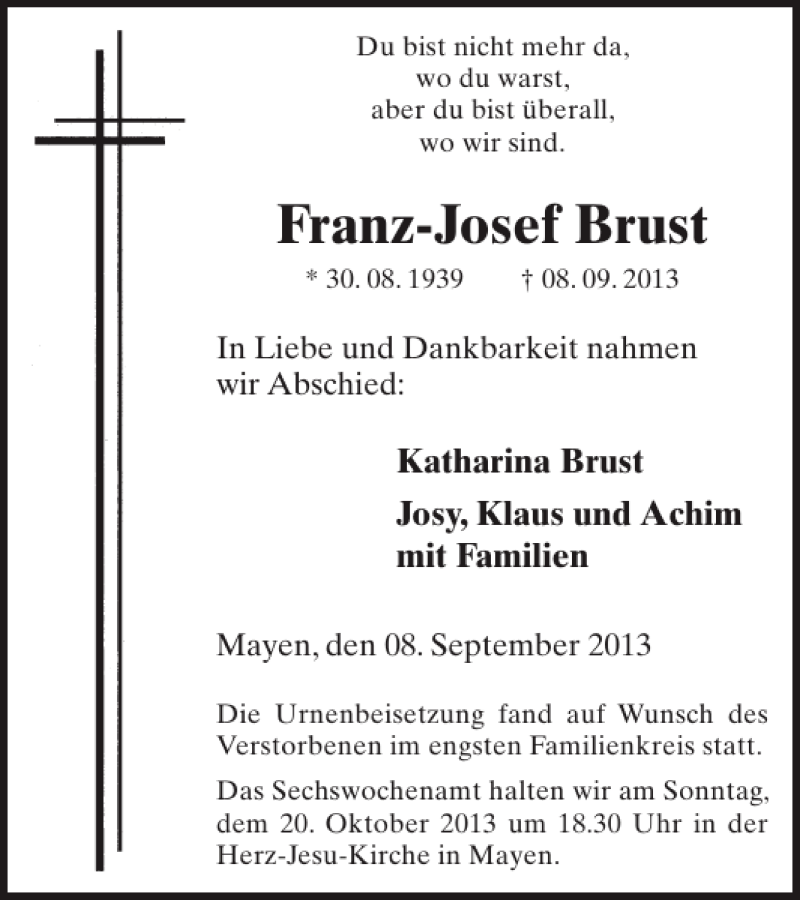 Hier finden Sie alle Traueranzeigen aus der Zeitung, die bisher für Franz-Josef Brust erschienen sind. Weitere Traueranzeigen, die in der Zeitung erscheinen, werden hier ebenfalls aufgelistet