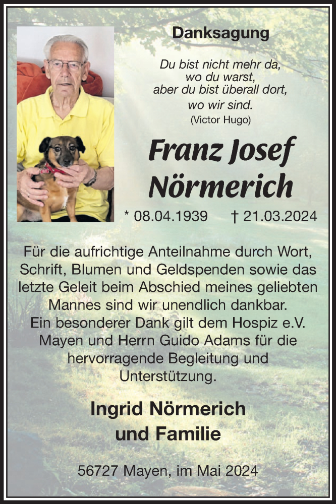 Hier finden Sie alle Traueranzeigen aus der Zeitung, die bisher für Franz Josef Nörmerich erschienen sind. Weitere Traueranzeigen, die in der Zeitung erscheinen, werden hier ebenfalls aufgelistet