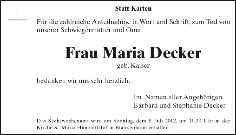 Hier finden Sie alle Traueranzeigen aus der Zeitung, die bisher für Frau Maria Decker erschienen sind. Weitere Traueranzeigen, die in der Zeitung erscheinen, werden hier ebenfalls aufgelistet