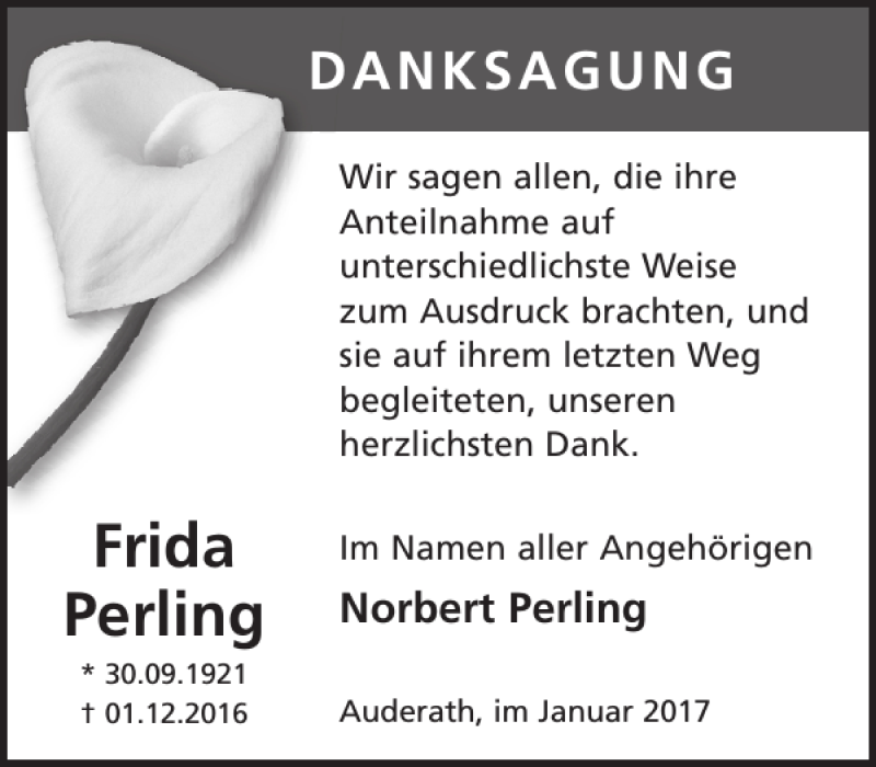 Hier finden Sie alle Traueranzeigen aus der Zeitung, die bisher für Frida Perling erschienen sind. Weitere Traueranzeigen, die in der Zeitung erscheinen, werden hier ebenfalls aufgelistet
