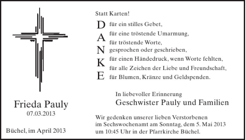 Hier finden Sie alle Traueranzeigen aus der Zeitung, die bisher für Frieda Pauly erschienen sind. Weitere Traueranzeigen, die in der Zeitung erscheinen, werden hier ebenfalls aufgelistet