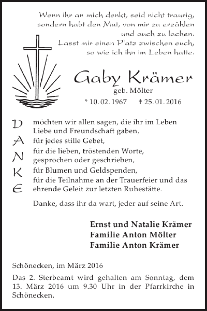 Hier finden Sie alle Traueranzeigen aus der Zeitung, die bisher für Gaby Krämer erschienen sind. Weitere Traueranzeigen, die in der Zeitung erscheinen, werden hier ebenfalls aufgelistet