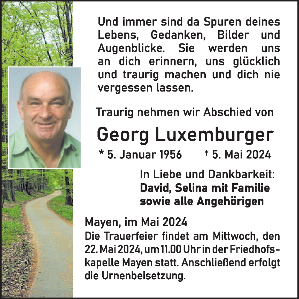 Hier finden Sie alle Traueranzeigen aus der Zeitung, die bisher für Georg Luxemburger erschienen sind. Weitere Traueranzeigen, die in der Zeitung erscheinen, werden hier ebenfalls aufgelistet